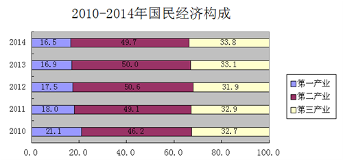 2014年國民經濟三次產業結構比為16.5:49.7:33.8。第一、二、三產業對經濟增長的貢獻率分別為11.8%、61.3%和26.9%。