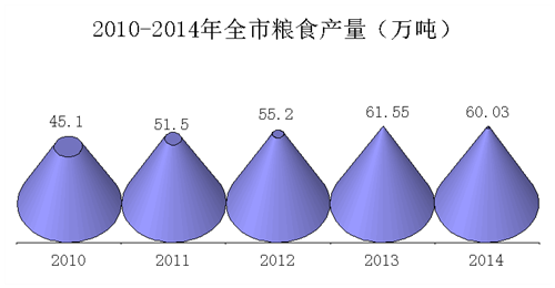 2014年全市實現農林牧漁業總產值69.87億元,比上年增長4.7%,其中:農產品產值41.7億元,增長6 %;畜產品產值21.85億元,增長11.9%。