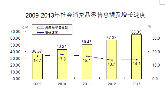 全市全年實(shí)現(xiàn)社會(huì)消費(fèi)品零售總額65.39億元,比上年增長(zhǎng)14.1%。